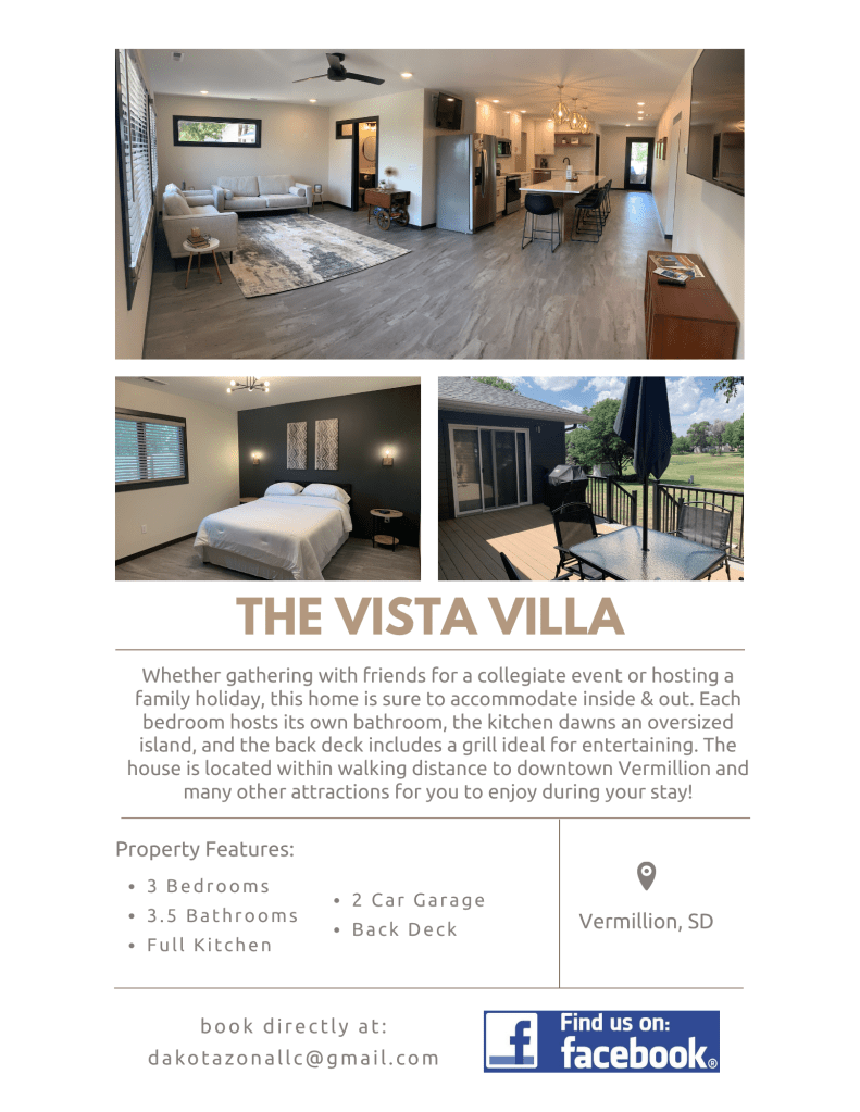 Looking for accommodations for a short term stay in Vermillion centrally located within all of the towns hottest happenings?? Look no further! AMS & Dakotazona partners saw a need for vacation rentals in Vermillion and collaborated to remodel the home pictured below into THE VISTA VILLA!! Visit the Facebook page or Airbnb.com for booking info.